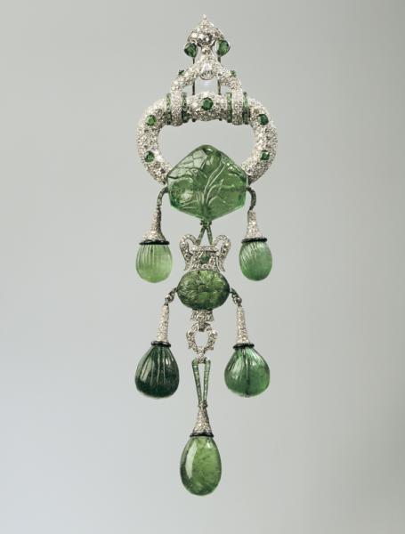One of the most significant and well-known jewels in Marjorie’s collection, still housed at Hillwood, is an emerald and diamond pendant brooch made by the London branch of Cartier in the 1920s. This iconic piece, emblematic of the marriage of historic gems with innovative design, features more than 250 carats of carved Indian emeralds from the Mughal period, including a large emerald carved with a seventeenth-century Mughal motif of a flower, with a Persian inscription on one side.